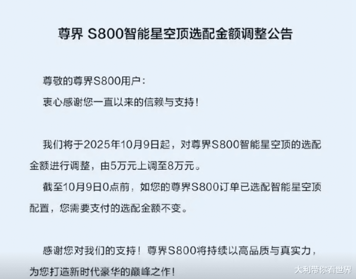 根据鸿蒙智行官方的公告,从2025年10月9日开始,尊界S800的智能星空顶选配价格就要从5万涨到8万了。这个涨幅达到60%,确实不小。不过华为还算厚道,如果你在10月9日零点之前就已经下单选配了,那还是按原价5万算,算是给早期用户的一个保障。